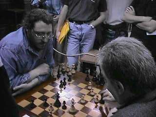Dentro de pocas semanas Garri Kasparov pondrá oficiosamente en juego su corona de campeón enfrentándose a Vladimir Kramnik. Y digo oficiosamente porque el título que detenta Kasparov no es el oficial de la entidad rectora del ajedrez, esto es la FIDE, y también porque la forma en que Kasparov determina al eventual desafiante, está lejos de ser democrática y más aún, justa. Podemos recordar que hace dos años se disputó un match entre Alexei Shirov y el citado Kramnik, el ganador debía enfrentar luego a Kasparov, y sin embargo Shirov todavía está esperando. Se comprueba que es mejor sistema áquel de depende de una estructura formal de competición que aquella que nace del personalismo de un único protagonista. Por discutible que parezca la primera y por destacado que fuese el segundo, siempre atiende más a la justicia general aquello que es convenido por la mayoría. Un aperitivo del match se vio en Frankfurt donde disputaron dos partidas a media hora por jugador que finalizaron en tablas. Partida No 197. Frankfurt 2000. Blancas: G. Kasparov. Negras: V. Kramnik, Siciliana Sveshnikov. 1.e4 c5 2.Cf3 Cc6 3.d4 cxd4 4.Cxd4 Cf6 5.Cc3 e5 6.Cdb5 d6 7.Ag5 a6 8.Ca3 b5 9.Cd5 Ae7 10.Axf6 Axf6 11.c3 Ag5 12.Cc2 Tb8 13.a3 a5 14.Ad3 Ce7 15.Cxe7 Dxe7 16.De2 0-0 17.0-0 Ad7 18.b4 axb4 19.Cxb4!? Tfc8 20.c4 bxc4 21.Axc4 Ae6 22.Ad5 Dd7 23.Da6 Tc3 24.Tfd1 Ag4 25.Tdb1 Tbc8 26.a4 h5 27.a5 Ah4 28.Db7? (Parece que las blancas han obtenido ventaja merced a la peligrosidad del peón "a" libre. Ahora Kasparov elucubra un espectacular sacrificio de dama pero como a veces ocurre, lo vistoso es enemigo de lo bueno. Lo prudente para intentar apoyar al peón y además defender el enroque era 28.Df1) 28...T3c7 29.a6 Ah3! (Un sacrificio más efectivo. Las blancas están obligadas a tomar el alfil y entonces las negras pueden optar por el jaque perpetuo) 30.gxh3 Dxh3 31.Db6 Ag5 32.Cd3 Dg4+ 33.Rf1 Dh3+ 34.Rg1 Dg4+ 35.Rf1 Dh3+ (1/2)