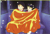 Kyousuke finds the emergency blanket for the shivering Madoka. He gives it to her to use, saying he'll be ok, but a sneeze gives him away. Madoka takes the blanket, sits him down, covers him with the blanket, and snuggles up under it together with him. Kyousuke tries to contact Kazuya telepathically. Unfortunately, he's asleep and thinks that the call is just a bad dream. Kyousuke apologizes to Madoka for asking her to ride this, and silently for what else he did. She smiles and says it's all right.