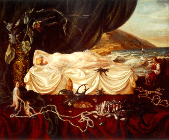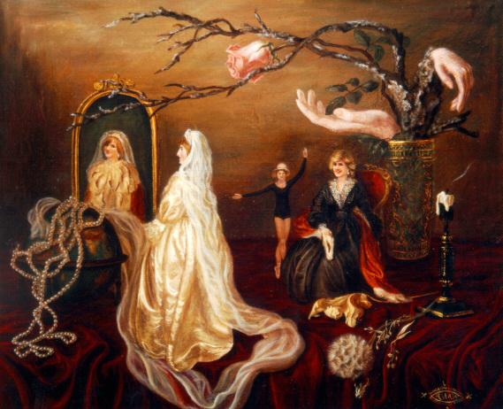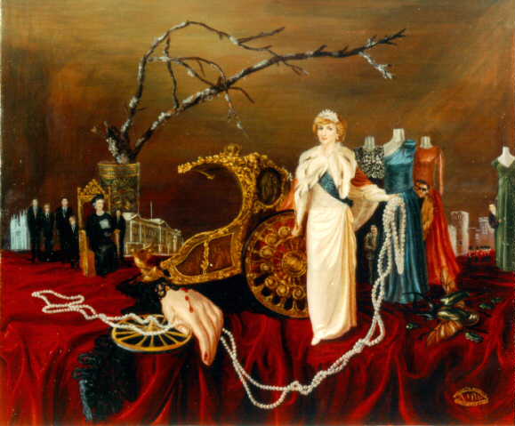 The purple colour of a velvet drape constantly reminds of the royal power and the blood. The red couler is the colour of violence, colour of disrupt and edited life. Napoleon deemed it English colour. Pearl is a well-known symbol of the angel�s tears. As "The Times" wrote about my first painting entitled "Life and Death", there are "the agents of the State spying on a radiant, bejewelled Diana ,and a tangled branch to represent the tentacles of the State" in it. A severed hand is a symbol of sacrifice and victim. Life�s wheel is near it.