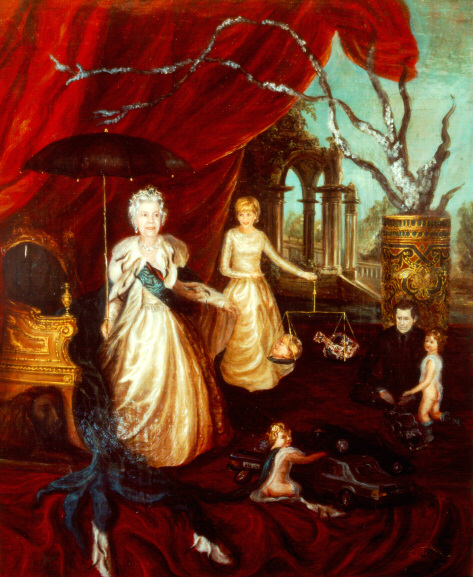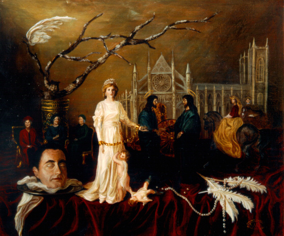 The Balance is not merely a symbol of justice in my last painting. Bran the Blessed, the ruler of Britain in the Celtic mythology had a magic reanimation boiler. The severed and reanimated head of Bran the Blessed head was brought into London and turned to enemy for defence. Two magic boilers are under the tongue in my painting entitled "Conspiracy". Will the boilers animate the crown of England and Diana, who is a symbol of the crown and Great Britain? What will become with the crown without Princess Diana?