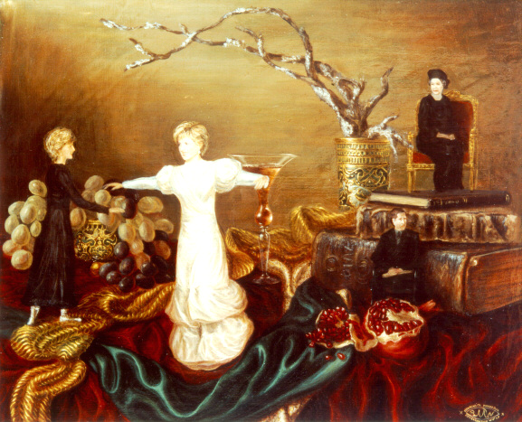 Princess Diana is alone in this picture, as she was alone in the Royal Family. Her part includes a bunch of grapes and wine as a symbol of vital fire and spiritual energy. Archangel Gabriel gave a bunch of grapes to Adam and Eva. The grapes are a symbol of the angel�s compassion. The compassion is Diana�s symbol. For both, her critics and her admires, Princess Diana was a kind of rebel. Compassion is always revolutionary. Pomegranate reminds of spilled blood. "Death". Defenceless and naked, Diana cannot protect herself anymore. But now she has placid skies and deep in peace spirit. "Future", "Conspiracy". I analyse the last train of events in these paintings. |