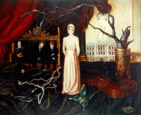 The Windsor Royal Family have declined Lady Diana�s example. It was a struggle of two political programmes of the monarchy development. And Monarchy needs to adapt and to change in order to survive. "I�ll flight to the end",- she said. My paintings only illustrate the words of Princess Diana. It was a prophecy for her. A prophecy that has come true. Diana was very active lately. She had become free and economically independent, went her own way. Prince Charles and Princess Diana were rivals in the political life, because every time, when you read about Diana, you can�t help thinking : and what about Charles? What is he doing? |