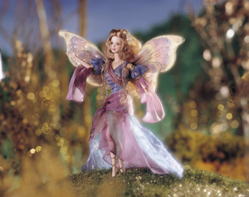 Available in June Fairy of the Forest™ Barbie® Barbie® doll looks enchanting as a beautiful fairy, shimmering in an iridescent gown of blue, purple and green. Her fitted bodice gives way to a sheer, flowing skirt that sweeps the ground. Golden cords adorn her legs, and golden highlights add special touches. Delicately colored and dusted with golden glitter, her magnificent wings provide the perfect ethereal touch. And just like a "real" fairy, Barbie has pointed ears. |
