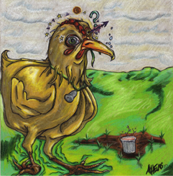 1997 med:ink color pencil "Annabelle" I raised a chicken from a chick, whom I found out by accident loved blush wine. This is the one time I she was drunk!
