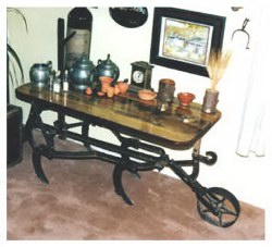 Coffee table from used lumber. This old plow serves well as a table after (scaled down replica of a renaissance table) I gave it a top from a distressed drip edge of our house.