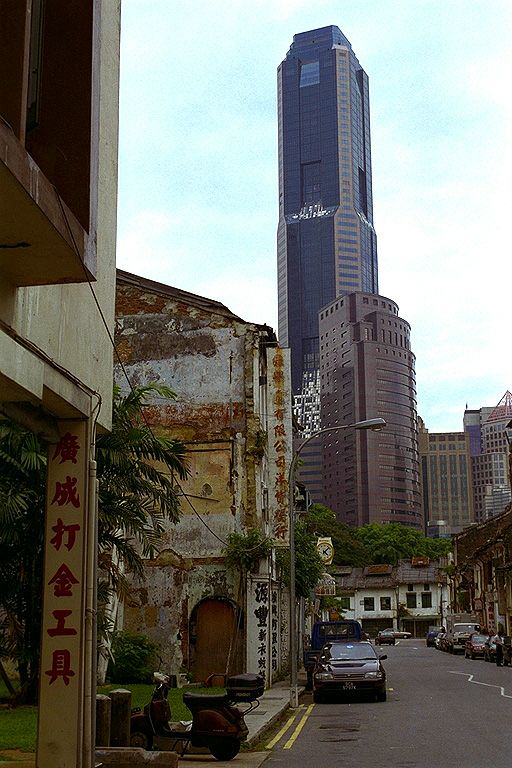 This picture shows the contrast between the modern skyscrapers and an old street which reserves some culture of the nation.