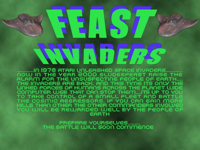 Feast Invaders is a game being coded by a guy from Sweden, all the graphics, sound and game design is down to me. It's a simple invaders clone to tie in with the release of the sludgefeast single "rock 'n' roll" which features a screen shot from the original space invaders on the sleeve.