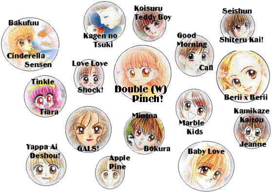 Apple Pine Baby Love Bakufuu Cinderella Sensen Berii x Berii Double Pinch! GALS! Good Morning Call Kagen no Tsuki Kamikaze Kaitou Jeanne Koisuru Teddy Boy Marble Kids Mintna Bokura Seishun Shiteru Kai! Tinkle Tiara Stories that I don't have pictures for: Abunai Paradise Drop Kick |