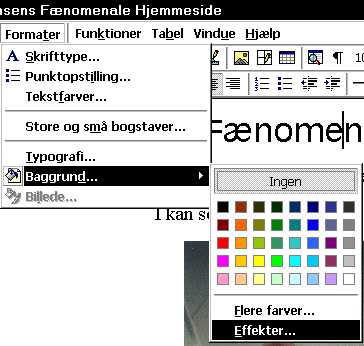 Ganske smart, ikke? Baggrundsfilen hedder på min maskine: "image8.jpg". Gem dokumentet igen og du er klar til at sende det på nettet. Husk at du skal sende index.htm sammen med de billeder, du bruger, altså baggrundsbilled-filen og illustrations-filerne. Din mappe som kunne hedde "index", skal nu indholde følgende: index.htm, hans.jpg samt image8.jpg. Husk små bogstaver. Nu skulle du være klar til at sende noget på nettet.