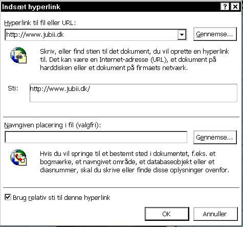 og skriv adressen til netstedet, hvortil man skal henvises. Her er der eksempelvis henvist til Jubii-søgemaskinen. Hyperlinks til andre steder på nettet starter altid med http://