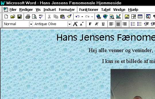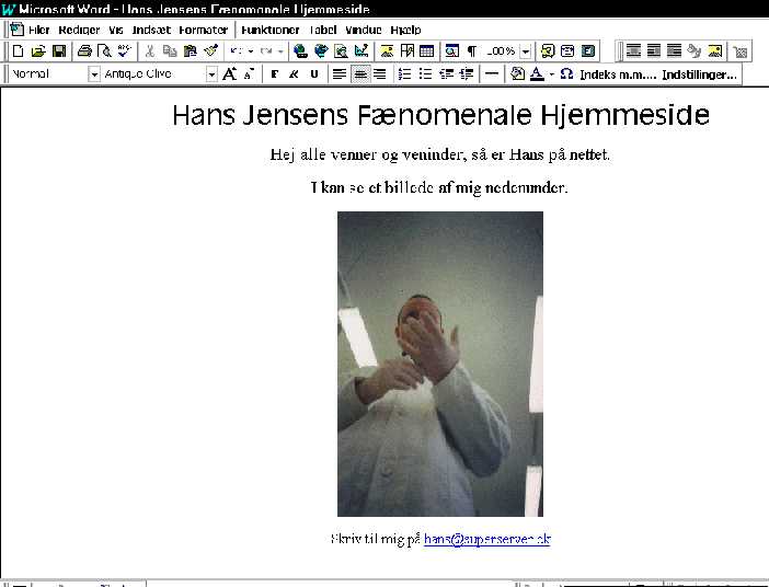Når du laver din første hjemmeside, kan det være en fordel at bruge et program, som du kender. Her er Word 97 en løsning. Du åbner programmet, som du plejer, og kan lave overskrifter og tekst på samme vis som ved en almindelig .doc-fil. Her er et eksempel med et billede, der hedder "hans.jpg":