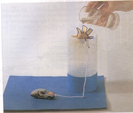 que tenga al otro extremo un coche. Si hacemos caer un chorro de agua sobre la rueda del molino... ¡ el coche se mueve¡ |