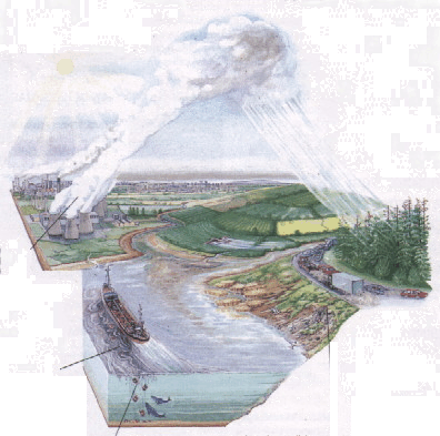 ÁCIDA La lluvia ácida está causada principalmente por el azufre y el nitrógeno despedidos por las centrales eléctricas, la industria y los motores de los vehículos. Cuando toda esta contaminación se combina con el vapor de agua , los rayos solares y el oxígeno en la atmósfera, se producen ácido nítrico y sulfúrico. Esta mezcla cae con la lluvia incrementando la acidez de los lagos y ríos. Estas condiciones defavorables a menudo producen un decenso en el número de animales y plantas. |