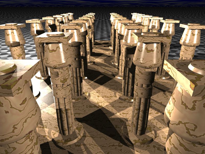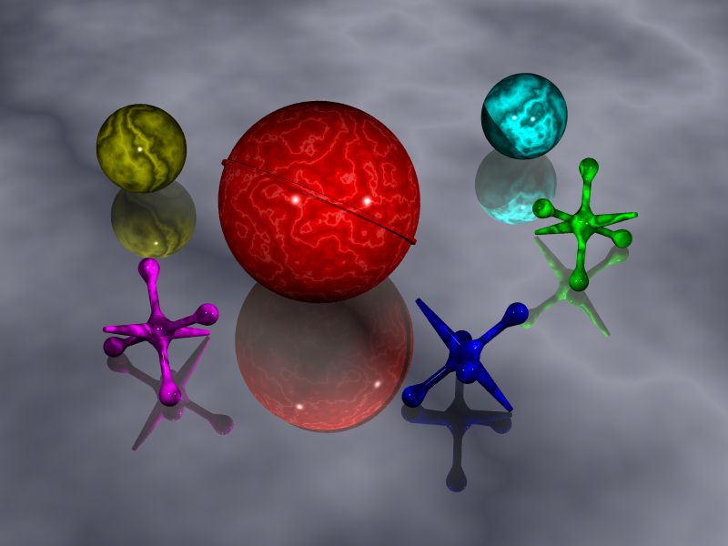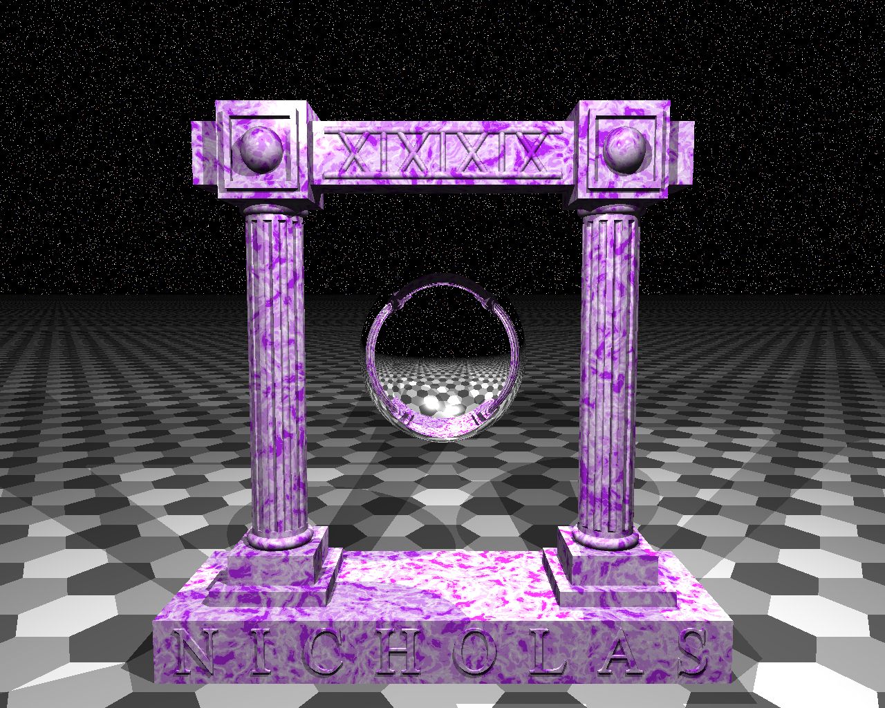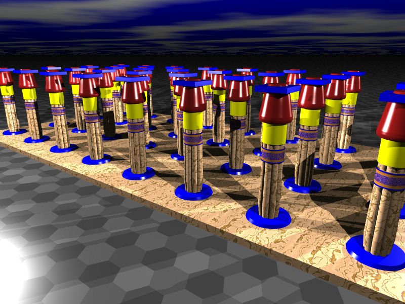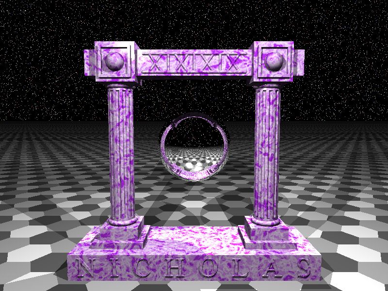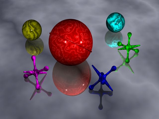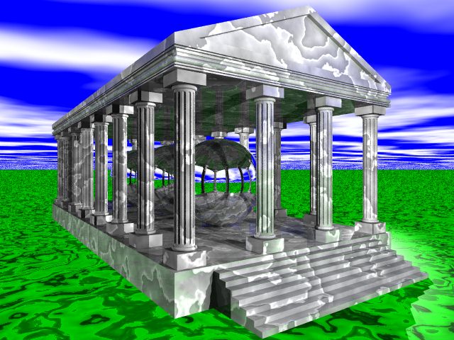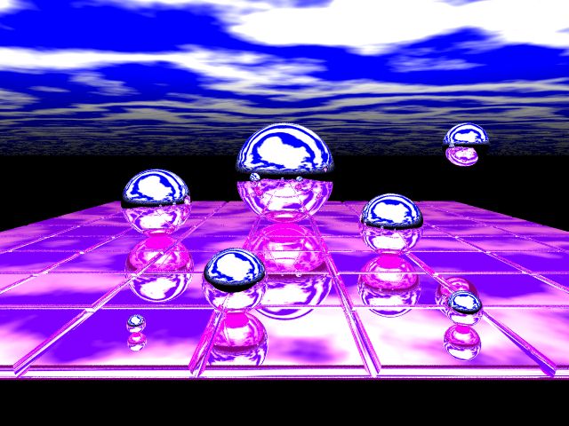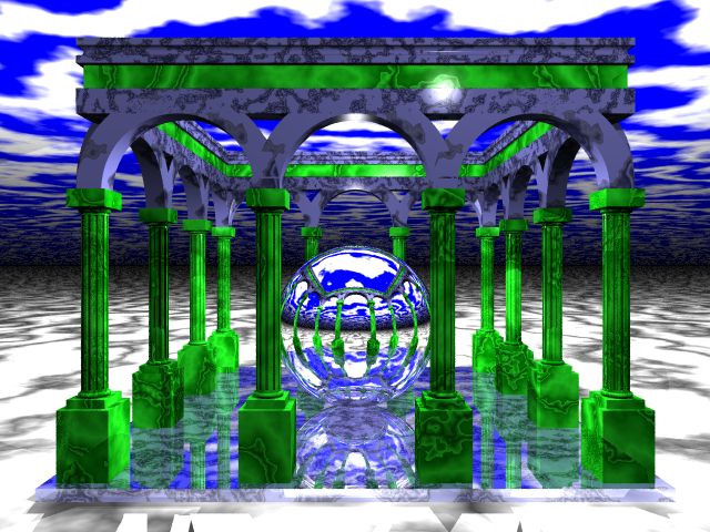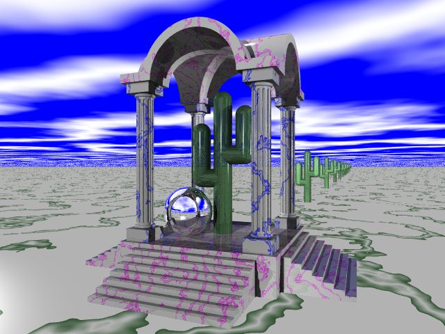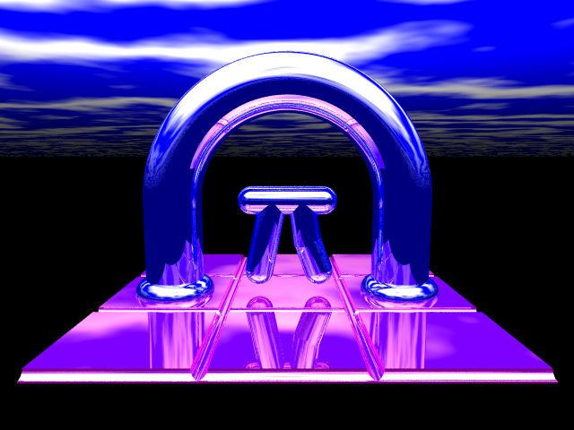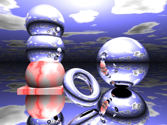 All of these images I created using a program called POV-Ray...the incredibly powerfull and FREE raytracer. The images are listed in roughly the order that I generated them as I was learning to use POV-Ray. All images are JPG or GIF format. Bear in mind that POV-Ray generates images in BMP format so the original files are much larger. There is some image degradation as a result of converting from BMP to JPG. For most images you have a choice of 640x480, 800x600, or 1280x1024 resolution and the file size is listed to give you some idea of the download time.