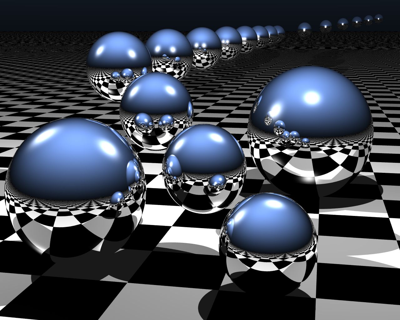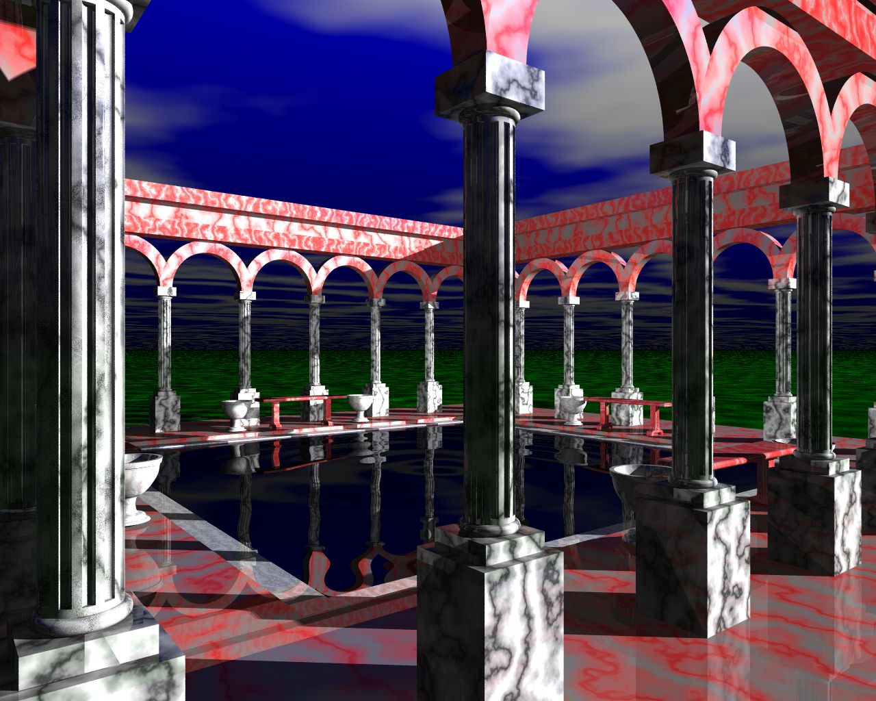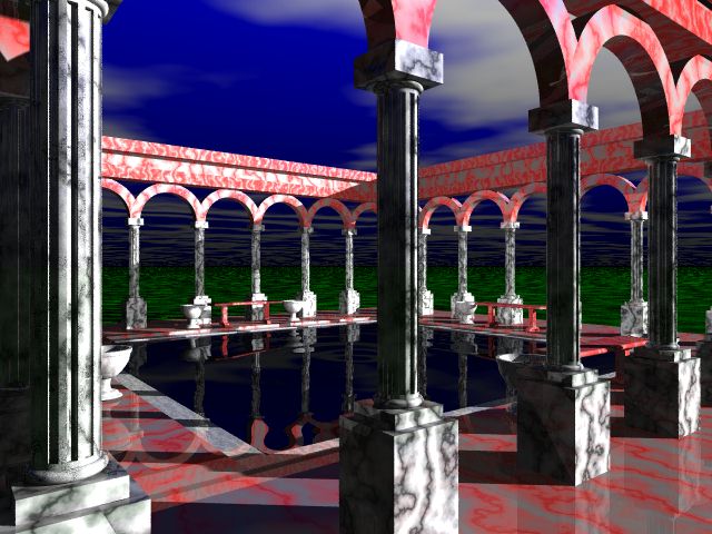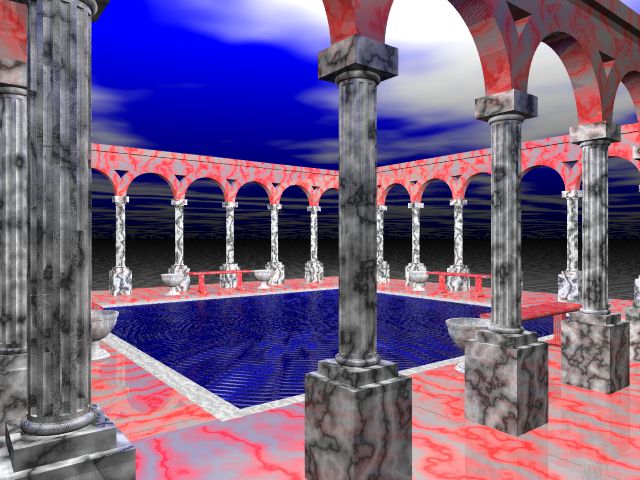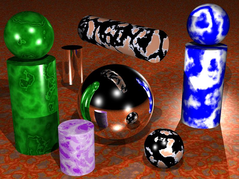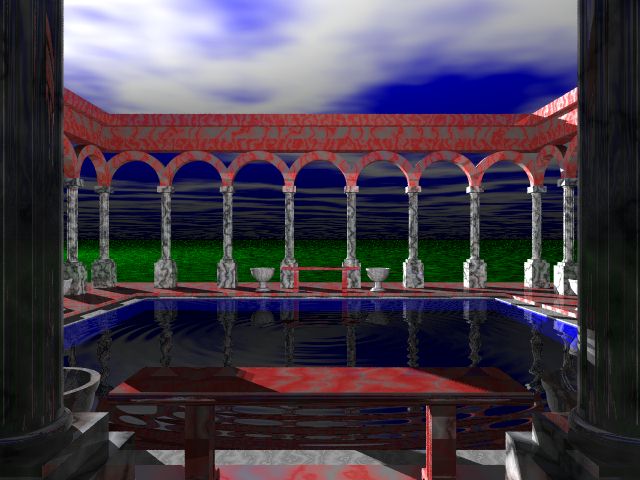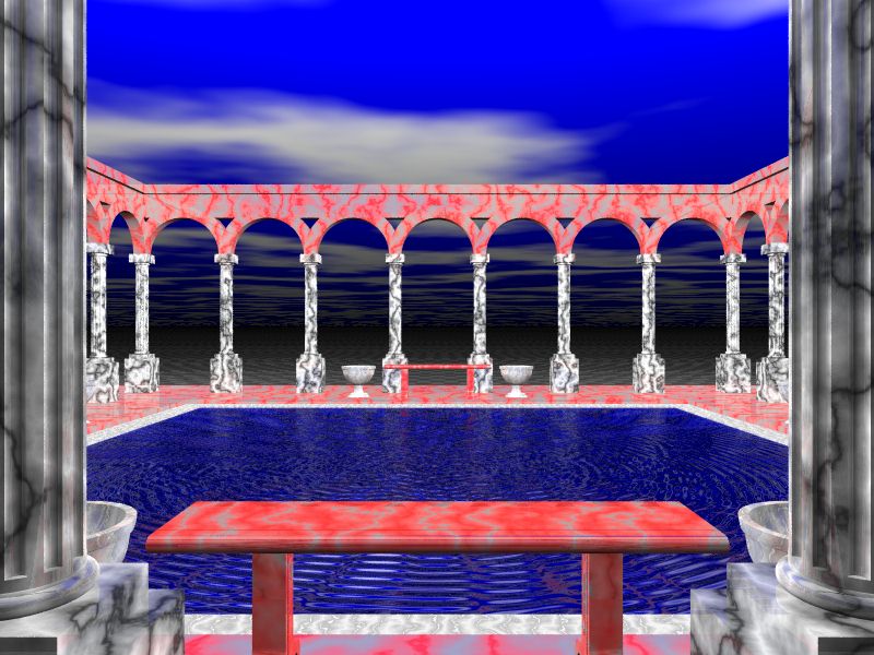 All of these images I created using a program called POV-Ray...the incredibly powerfull and FREE raytracer. The images are listed in roughly the order that I generated them as I was learning to use POV-Ray. All images are JPG or GIF format. Bear in mind that POV-Ray generates images in BMP format so the original files are much larger. There is some image degradation as a result of converting from BMP to JPG. For most images you have a choice of 640x480, 800x600, or 1280x1024 resolution and the file size is listed to give you some idea of the download time.
