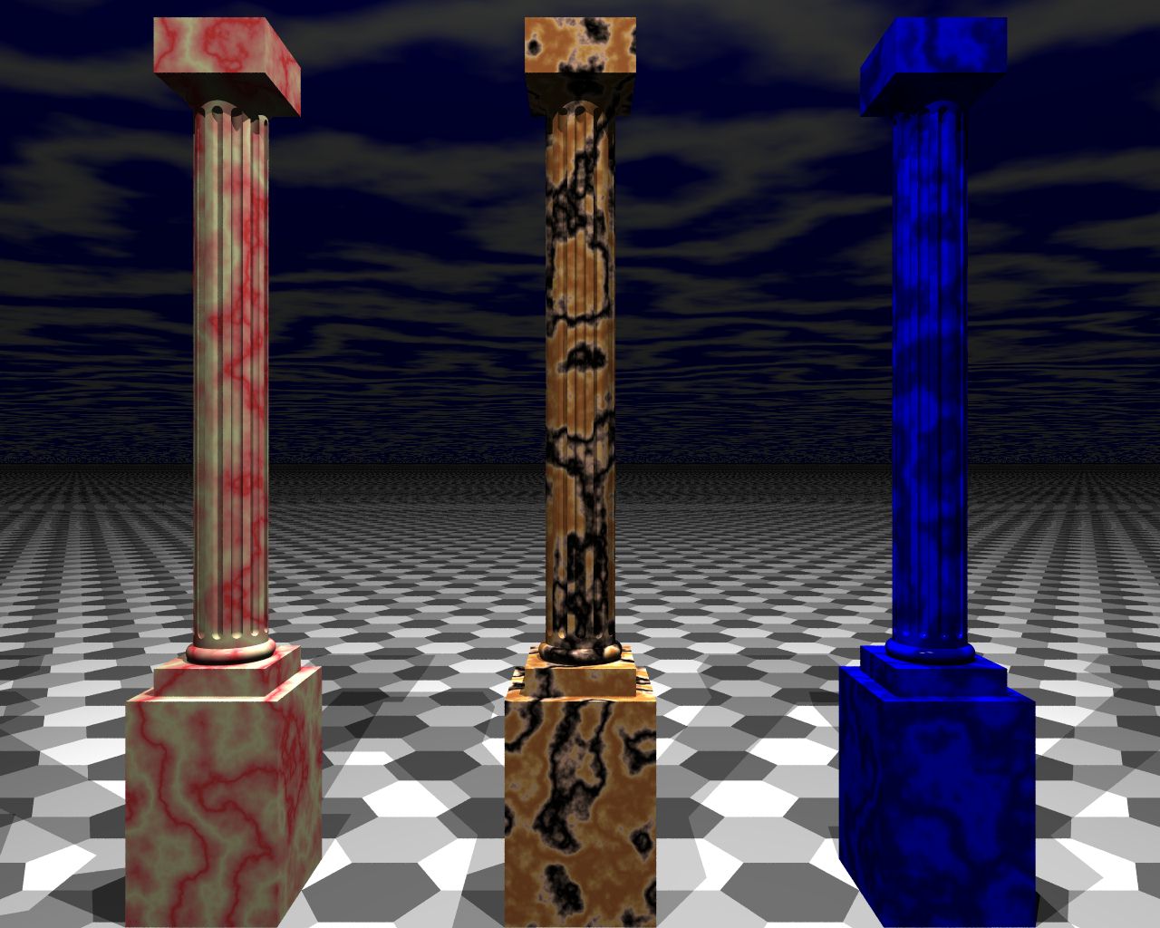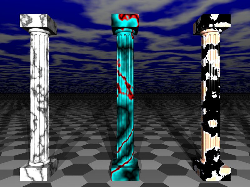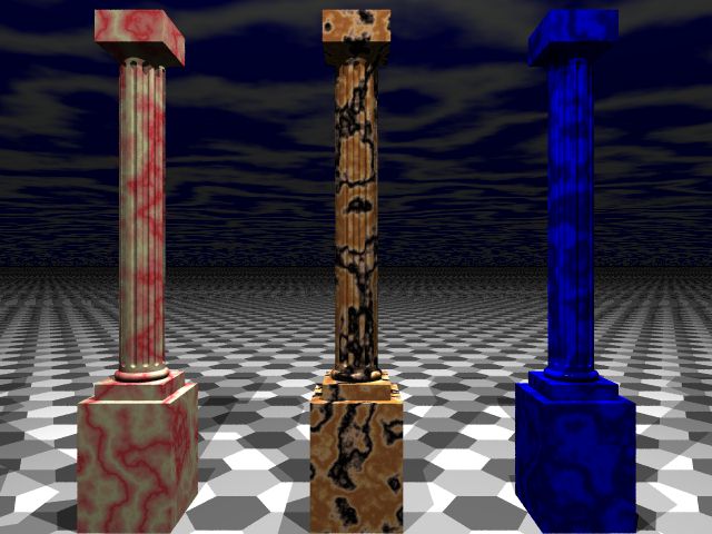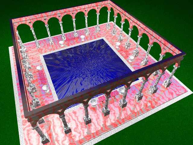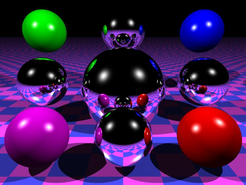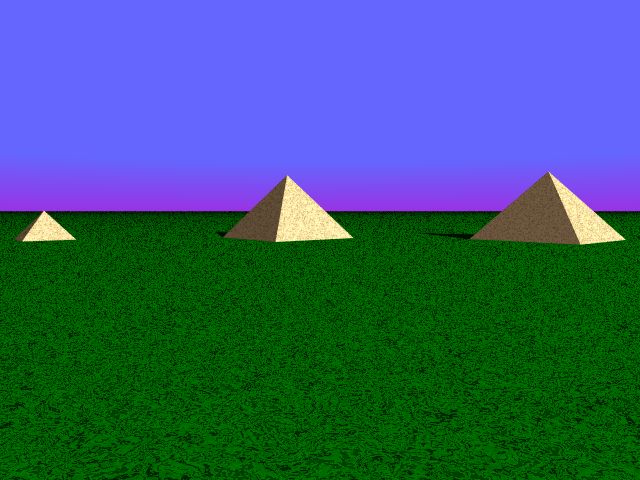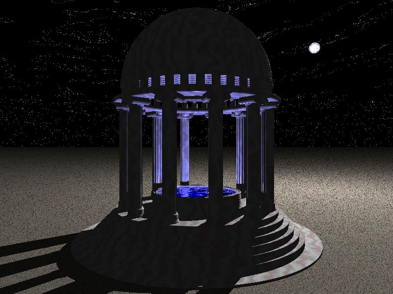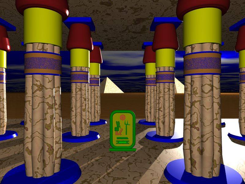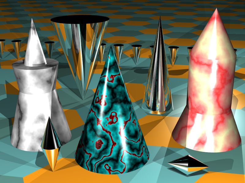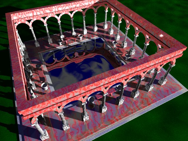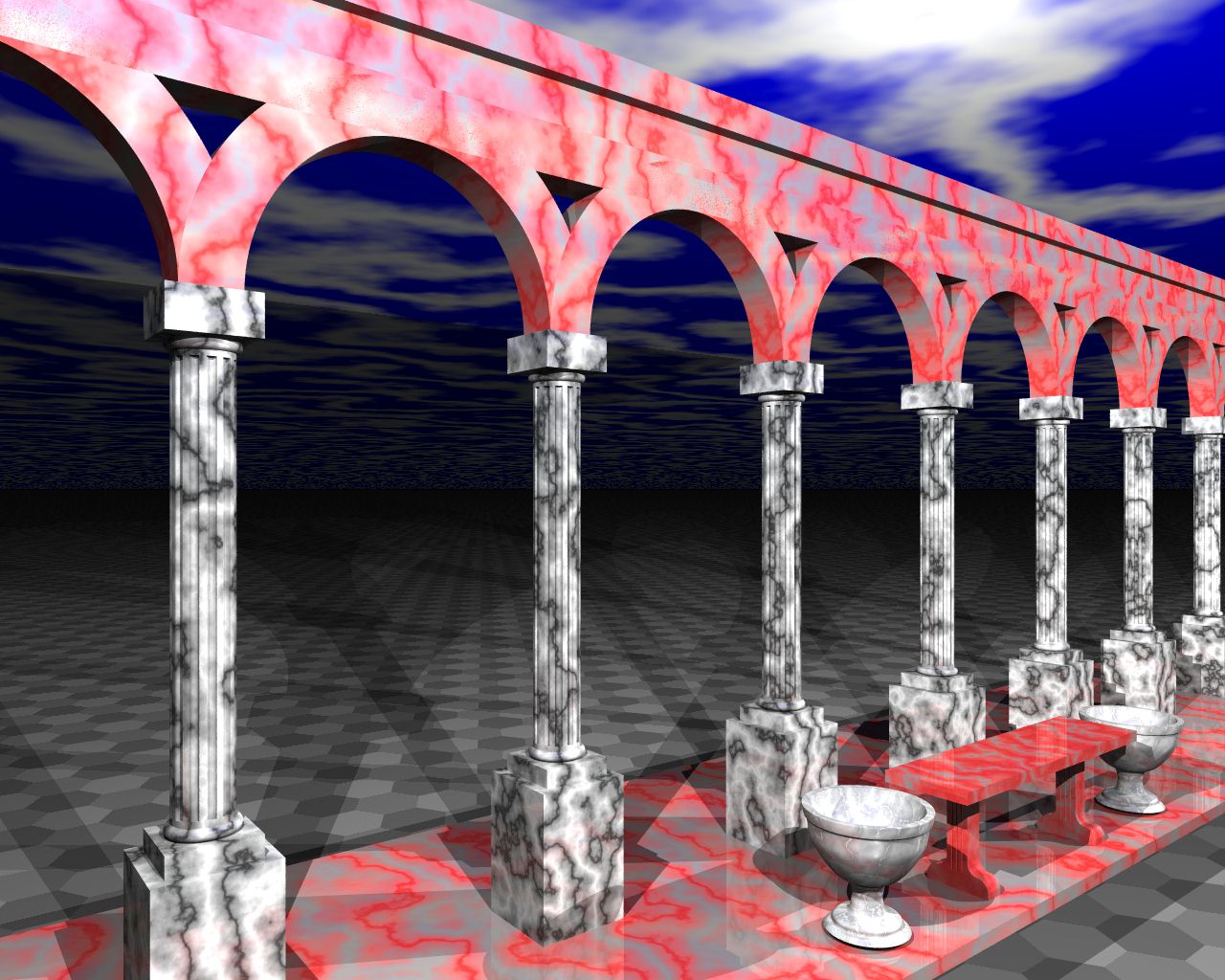 All of these images I created using a program called POV-Ray...the incredibly powerfull and FREE raytracer. The images are listed in roughly the order that I generated them as I was learning to use POV-Ray. All images are JPG or GIF format. Bear in mind that POV-Ray generates images in BMP format so the original files are much larger. There is some image degradation as a result of converting from BMP to JPG. For most images you have a choice of 640x480, 800x600, or 1280x1024 resolution and the file size is listed to give you some idea of the download time.