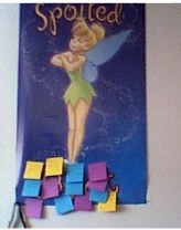 Sorry that the page layout is so sloppy, but I still have yet to master this thing! Here is what you will most likely see when you first come in. Not only is this poster of Tinkerbell sacchrine sweet and sassy, but as you can observe, she makes a great place to put all my sticky notes of phone numbers and what not!