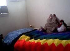 Next up we have my bed... oooh la la... Here we will find not only my rainbow blanket that I made, but also my good friend Lenny the Cat! (And no, I am not in the third grade, nor am I a psychopath with a stuffed animal fetish, but I do have this thing about collecting toys and useless crap that has some kind of sentemental value!)