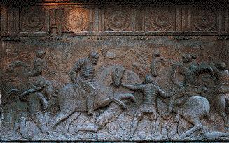 La portada del lado occidental, que se considera la principal entrada del Palacio, es de orden dórico, con cuatro grupos de columnas dobles estriadas, cuyas basas y capiteles están preciosamente adornados (a la izquierda foto de uno de los bajo-relieves de los pedestales). Entre las columnas se abren tres puertas: la central, de gran tamaño, sirve de apoyo a la estatua de una mujer que sostiene una granada simbólica en una de sus manos y extiende la otra en ademán de señalar, como haciendo al Emperador la ofrenda del palacio. Las otras dos puertas son más pequeñas y están adornadas con grupos de frutas en ménsulas y con medallas en sus tímpanos. Sobre estas portadas aparecen medallones enmarcados en piedra serpentina.
