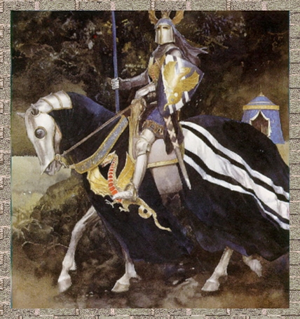 Knight and horse are wearing a dragon, possibly the Celtic Pendragon banner.