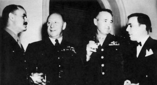 A few minutes before my command performance for General Hap Arnold, Commanding General Army Air Forces, at Bolling Field on October 11, 1944, I had a moment of relaxation with some of the General's colleagues who were in the audience that night: (left to right) Lt. General Joseph T. McNarney; Air Marshal Sir William L. Welch, RAF; and Lt. General Barney Giles, Chief of Air Staff, Army Air Forces.