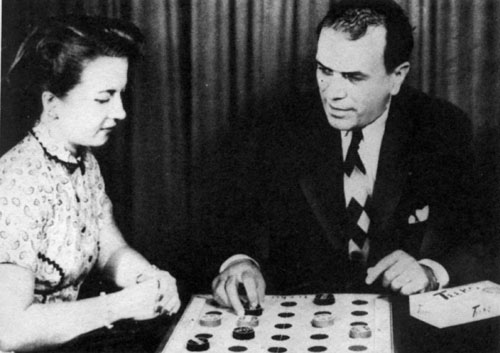 My secretary, Miss Steffi Storm, during the 1950 Fairview Teeko Club championship, which I won with 30 victories and no losses. Miss Storm subsequently became Mrs. John Scarne but not, I hope, just because I won this championship.