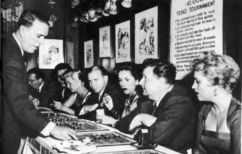 At New York's famous "21" Club in 1955, I took on ten "Teeko" players simultaneously and won all games. Seven of my opponents are shown here: Steve Allen, Larry Evans, Frances Langford, John Crawford, Jinx Falkenberg, Walter Slezak, and Judy Holliday.