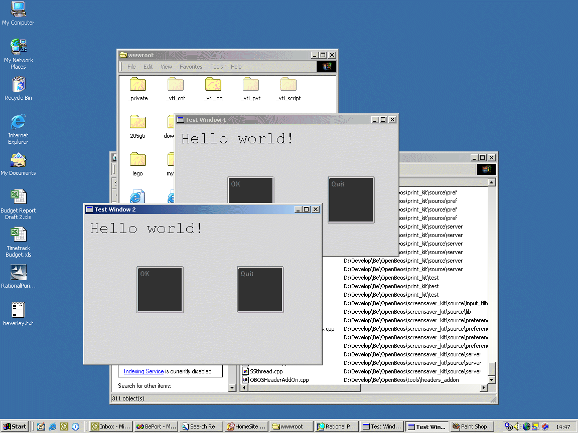 To reduce the amount of development work involved winBe will draw heavily from the source code contributed to the OpenBeos project. Initially I'm concentrating on getting the Application Kit, Interface Kit and Support Kit supported.