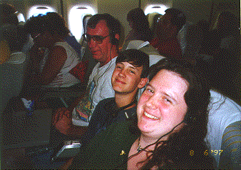 This is a picture of my Dad, brother Kirt and I on the plane back to the States after our trip. Even after the long flight, we can still smile. We may not look our best, but we're smiling anyway. :)