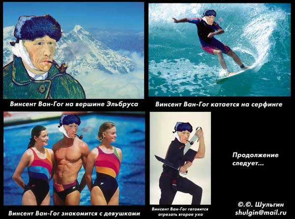 It is my comic collage :o) Vincent van Gogh At top of Elbrus. Vincent van Gogh Is rolled on surfing. Vincent van Gogh Gets acquainted with the girl. Vincent van Gogh Prepares to cut off second ear.