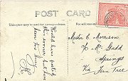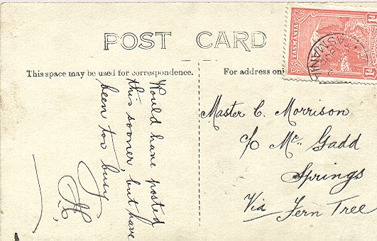 A postcard sent from Mountain River, on the south side of the Mountain. Nowadays it's a picturesque, outlying rural suburb. Back then it was apparently far enough away to send postcards from. |