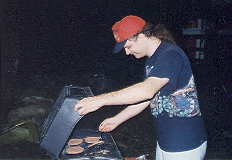 We'd bought some hamburgers (I was still an omnivore at this stage), and Alex had confessed to me that he had only the slenderest grasp of the mysteries of food preparation. This proved to be no idle claim, though I confess I acquitted myself just as poorly with these hamburgers. Just how one renders a frozen hamburger almost inedible by virtue of putting it on a bbq grill is a bit of an enigma. In fact I now suspect that these were examples of an infamous brand of near-inedible hamburger which I was told about at CF9 - in which case we can both be excused.)