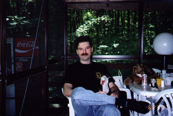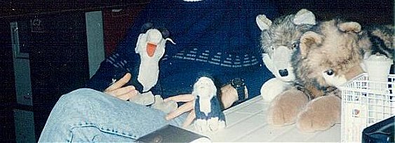So now I just had to hope that my host was there to meet me. As I came out into the terminal I saw a crowd of people standing behind a rope on the other side. One of them was clutching a large Meeko plushie. This was Alex Rakune, who'd driven up from Boston to collect me, and this was my first RL meeting with another furry. I hadn't really realised till then how alone I really was, on the other side of the world, and it was reassuring to see a familiar face. Meeko's was the familiar face. Alex I only knew from a blurry snapshot, but the fact that he was holding a Meeko sort of fused them into one familiar entity.