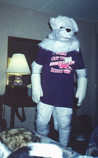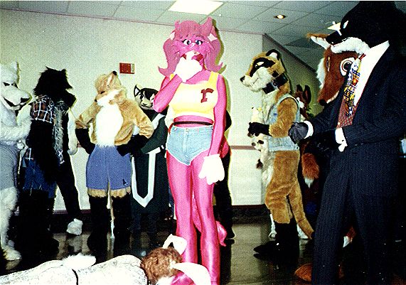 There was more to this day, but how can I be absolutely certain I've got my con days straight? Was this the day I met Carole Curtis, attended the plush sig, ate those funny cross-hatched potato chip things? I'd sneezed in several states, but I don't think I'd come in the USA yet. More disturbingly, what might the precise volume of semen ejaculated at AAC have been, given the lamentable behaviour of so many furries? Might it have filled that giant bidet? Should I have written this somewhere else after all, where I might not have had a couple of beers?