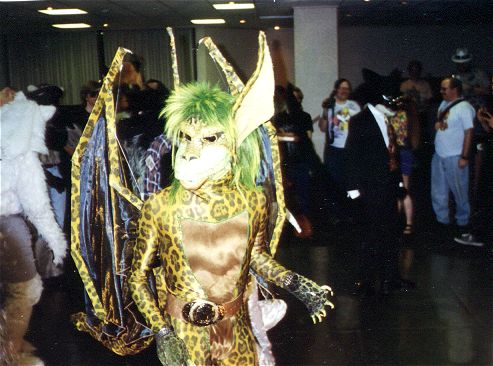Second day of the Con. Alex and Flep hit the dealer's room big-time, buying mountains of stuff. I cruised in and out without purchasing a lot, but I was seduced into buying some of the 'Mad Racoon' comics. Whoever does them - sorry, but I've forgotten - they're a cut above the average furry fare. Uncle Erf, with multiple personality disorder, who is his own wife (and child), and who is subject to fits of hysterical jealousy which usually prompt him to storm out on himself, was definitely a favourite.