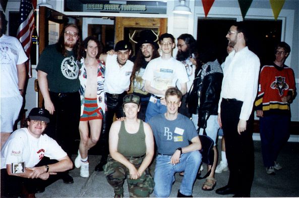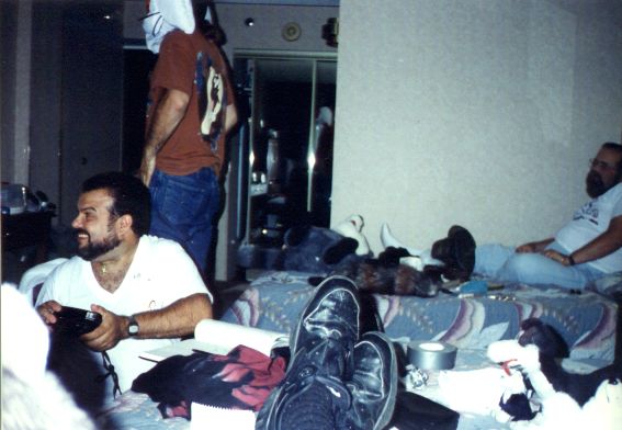 On this final full day of the con, I met Brian someoneorother; a really nice man who sold my Footrot Flats books and refused to take a commission, and declared he was going to up and move to Australia. This must have been on one of my last trips into the dealer's room. My very last trip was made without my con badge, which I had managed to misplace (I must have found it again, because it's blu-tacked to the doorframe over there.) In any case this sudden anonymity on my part caused a surprising reaction from security, who refused to let me in the door. Now this was my first con, and I imagine there is some good reason why a person shouldn�t be let into the dealer's room just before closing, on the final day, without a con badge, but the impression I got was that my badgelessness might be an indication that I was carrying plastic explosives. They agreed, after a while, to a compromise, whereby one of them would accompany me at all times as I strolled around the room - to what purpose I'm not very sure. Eventually I had the idea to find someone in the room who'd recognise me, and vouch for the fact that I wasn't a member of Sinn Fein, or worse, the vice squad. I attracted Groat's attention, who acknowledged that I was 'that bastard from Tasmania', and my minders detached themselves.