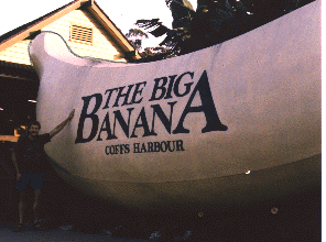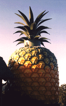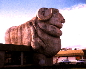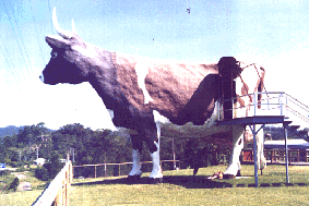 The strangest thing I saw was a large milk can on the roof of a shed. This may not sound very strange, but what was odd is that this milking can just wasn't big enough to be a 'Big Milking Can' (and believe me, I'm an expert on these things. In Australia we have the Big Pineapple, The Big Banana.... most of these idiotic things are in Queensland. you drive up the Pacific Highway, and every twenty-five miles "Oh, it's the Big Prawn", or the Big Cow or something. When I was a little kid, these were major tourist attractions, and it was everyone's ambition to go see the Big Pineapple if they went to Queensland.) Probably my favourite Big Thing is in New South Wales, though. The Big Sheep: a giant Merino Ram, at Goulbourn. I saw it at dusk one night. People who had climbed up inside it, were looking out through it's eyes, which were illuminated, so that the people resembled eyeballs, moving around in asynchronous, chameleon-fashion.)