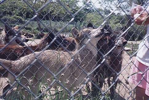 As it was about 95 degrees the wolves were rather lethargic, but the same could not be said for our hostess. We turned up slightly late for the presentation. The lady in question stood in front of a double wire fence, behind which the wolves gradually congregated - being coaxed forth from the shadow of their lair by the cubes of cheese which she kept slipping them through the fence. To the human audience of a couple of dozen, she delivered an obviously heartfelt sermon on the mistreatment of wolves by humans in America. I suppose I should note that I thoroughly agreed with her POV on absolutely everything she said, but I think that her presentation, which had a rather militant, if not military feel to it, in combination with her monopolisation of the wolves' attention, detracted from the experience that might have been. After a while I really wished she'd just leave off. I tried to tune her out and take in the wolves. Even though there was really no opportunity to make any personal contact with them, the mere fact of being in their presence was enough to make the day unforgettable. At the end of the presentation, she tried to get them to howl, but without much success. She blamed the heat, which is probably fair enough, but I suspected that howling 'on cue' would have been a pretty meaningless exercise for a wolf, so in a perverse sort of way, I was kind of glad they didn't.