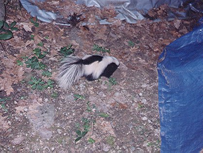 When we got back to the trailer there was one more encounter in store: a skunk! This was the first American animal I'd really encountered in its natural setting. She was a real beauty, too! (I find it hard to think of skunks as anything but female, which may come from the memorable female skunk at the end of Robert Lowell's famous poem 'Skunk Hour'.) This skunk was, if I recall, going through the pasta which had been turfed out the back of the trailer (what I can�t remember is how we came to have pasta there. Am I imagining this, Alex?) I managed to get a good snap of this lustrous apparition, and you can see it on the HTML version, which ought to be on my page by tomorrow.