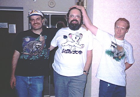 It was a pretty special moment for me. Like I said, this wasn�t long after the blossoming of ALF, and we'd kind of been the ones who got the ball rolling. Well, we wrote the FAQ together... well, I mean, we put into words what everyone else... look, someone must have recorded this stuff somewhere else!!) Anyway it was good to meet him in the atmosphere of controlled mayhem which suffused their rooms. His first reaction was to grab me in a big hug, as I seem to recall we'd had some idiotic email misunderstanding a few weeks before (based, as always, on my pattern of being completely affable for 99% of the time, and then unexpectedly flying into an irrational fit of "Just exactly what were you getting at when you said "and" three times in one sentence?!")