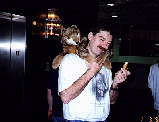 I think it was on this first night that Sarsha met her secret admirer, Lionus. She and I were walking down near the registration desk when Lionus paid Sarsha some compliment, and we invited him up. Lionus became the first and perhaps closest new friend I made at the con, and he still sends Sarsha love-letters sometimes, written in the persona of a 19th century British army officer stationed in India during the mutiny. I needle him and Sarsh now and again to let me print them on Sarsha's plush page, but as yet, no consent :)
