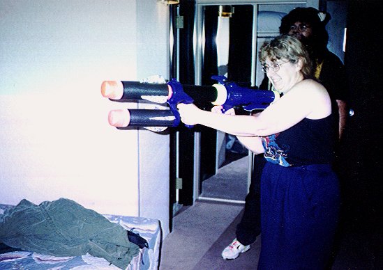 Ann had a bloody big missile launcher. It shot twin projectiles of some two feet in length, which, though really quite light and seemingly harmless were nonetheless expelled at a considerable velocity. She managed to shoot me in the nuts with this thing, which was kind of unexpected to say the least, but I decided it must be some Canadian greeting ritual.