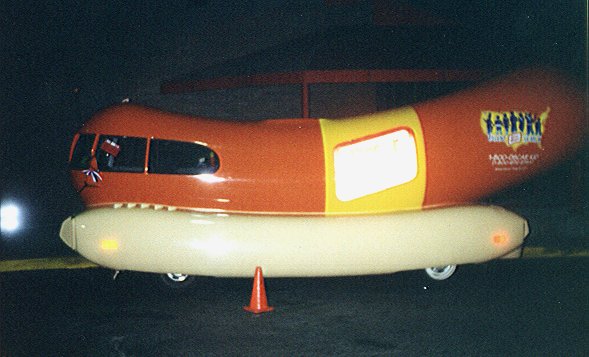 And now I must mention one of the early highlights of the con. The Wiener-mobile. I have no idea whether these are actually a common sight on American roads (I haven�t seen one since), but the only previous experience I'd had of this amazing vehicle was the episode of Rocko's Modern Life, where Rocko and Heifer drive across the US in one. I thought it was just a made-up thing for that cartoon, and so whereas most people thought it was amusing, I thought it was on at least a par with the Hanging Gardens of Babylon.