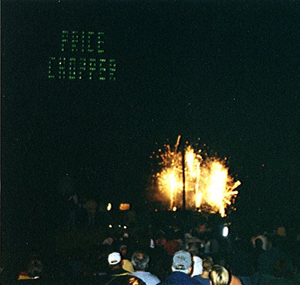 But the highlight - or at least the thing that always springs first to mind when I recall that night? The big office building beside the area from where the fireworks were released, was obviously the object of an innovative form of advertising promotion. The lights in the offices had been left on in such a pattern that they spelled out the name of what I assumed to be a chain of discount supermarkets or department stores. So the breathtaking spectacle of the Fourth of July fireworks display took place against the backdrop of a towering sign which read: "PRICE-CHOPPER"