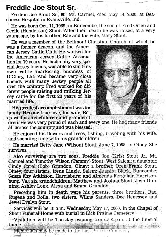 | This is the newspaper clipping that came out of the Mt. Carmel, Illinois newspaper a couple days after Freddie Joe Stout Sr. Died. He had a beautiful funeral which many people from all around the United States came to fell the sorrow with Fred's Wife, Betty. |