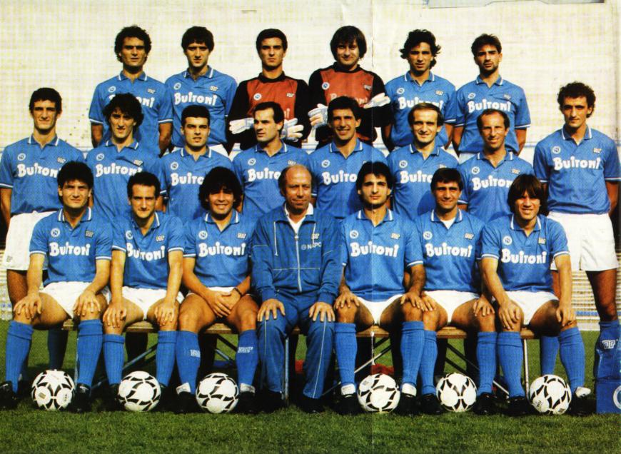 From left to right, upper row: Giuseppe Bruscolotti, Tebaldo Bigliardi, Raffaele Di Fusco, Claudio Garella, Andrea Carnevale, Massimo Filardi; middle row: Ciro Ferrara, Fernando De Napoli, Antonio Carannante, Giuseppe Volpecina, Salvatore Bagni, Moreno Ferrario, Luciano Sola, Alessandro Renica; bottom row: Ciro Muro, Costanzo Celestini, Diego Armando Maradona, Ottavio Bianchi, Luigi Caffarelli, Bruno Giordano, Pietro Puzone.