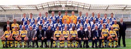 Front Row L-R: Roy Dolling (Youth Development Manager), Dave Bell (Director, Centre Of Excellence), Phil Bater (Director, Youth Football), Vernon Stokes (Director), Barry Bradshaw (Director), Geoff Dunford (Vice Chairman), Gary Penrice (Assistant Manager), Ian Holloway***** (Manager), Garry Thompson (Coach), Denis Dunford (Chairman), Ron Craig (Director), Bob Andrews (Director), Phil Kite (Physio), Ray Kendall (Kit Manager).