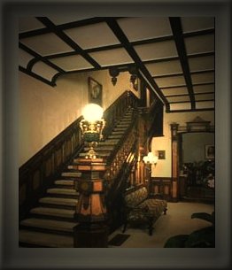softly in the background, and fresh cut flowers sitting among dark furniture